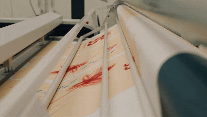 Kad dizains ir uzdrukāts, audums tiek izgriezts pēc precīzām piegrieztnēm, izmantojot automatizētas griešanas iekārtas. Griešanas process ir maksimāli efektīvs – tas ļauj precīzi izmantot materiālu, samazinot atgriezumu daudzumu un tādējādi arī ražošanas atkritumus.