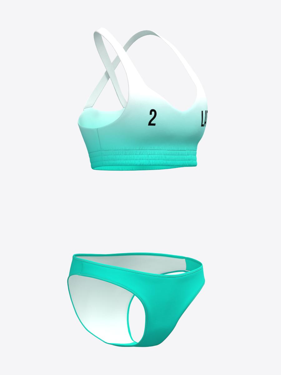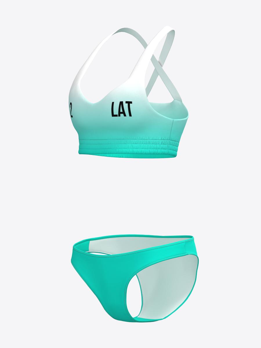 Viegla atbalsta sporta krūšturis ar dubultu priekšējo daļu un stingru, bet elastīgu apakšmalu nodrošina lielisku krūšu atbalstu gan intensīvod treniņos, gan sacensībās. Dziļais, sirds formas kakla izgriezums piešķir sievišķīgu akcentu, bet krusteniskās lences mugurpusē garantē drošu krūšu atbalstu. Bikini apakšdaļa ir stingra, pieguļoša un speciāli izstrādāta profesionālām atlētēm, nodrošinot stabilitāti un komfortu kustībā.
