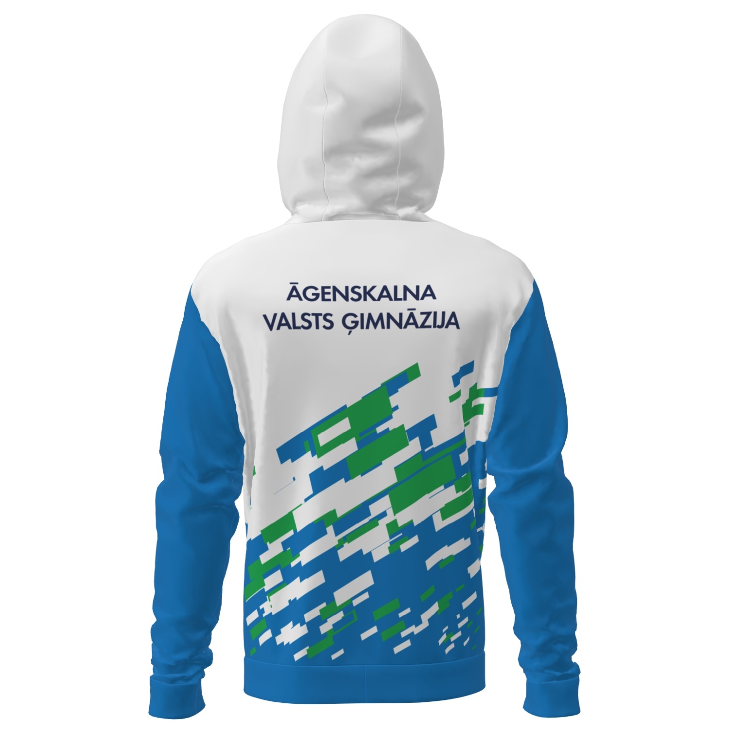 Džemperis ar kapuci Āgenskalna Valsts ģimnāzijas skolēniem. Paredzēta lietošanai ikdienā vai pārstāvot mācību iestādi ārpus tās. Regulāra piegriezuma džemperis ar oderētu kapuci, lielu priekšējo ķenguru kabatu un piedurkņu galos ir pieguļošas manžetes, izgatavots no īpaši silta un ūdeni atgrūdoša materiāla. Augsta noturība pret berzi un vides ietekmi.