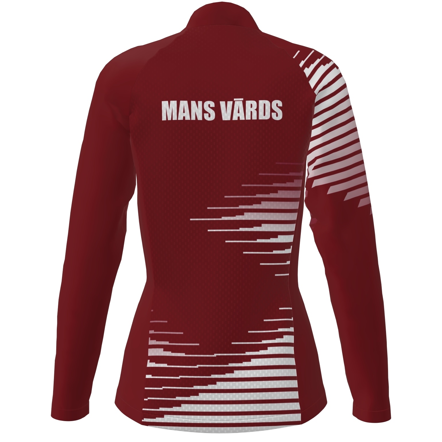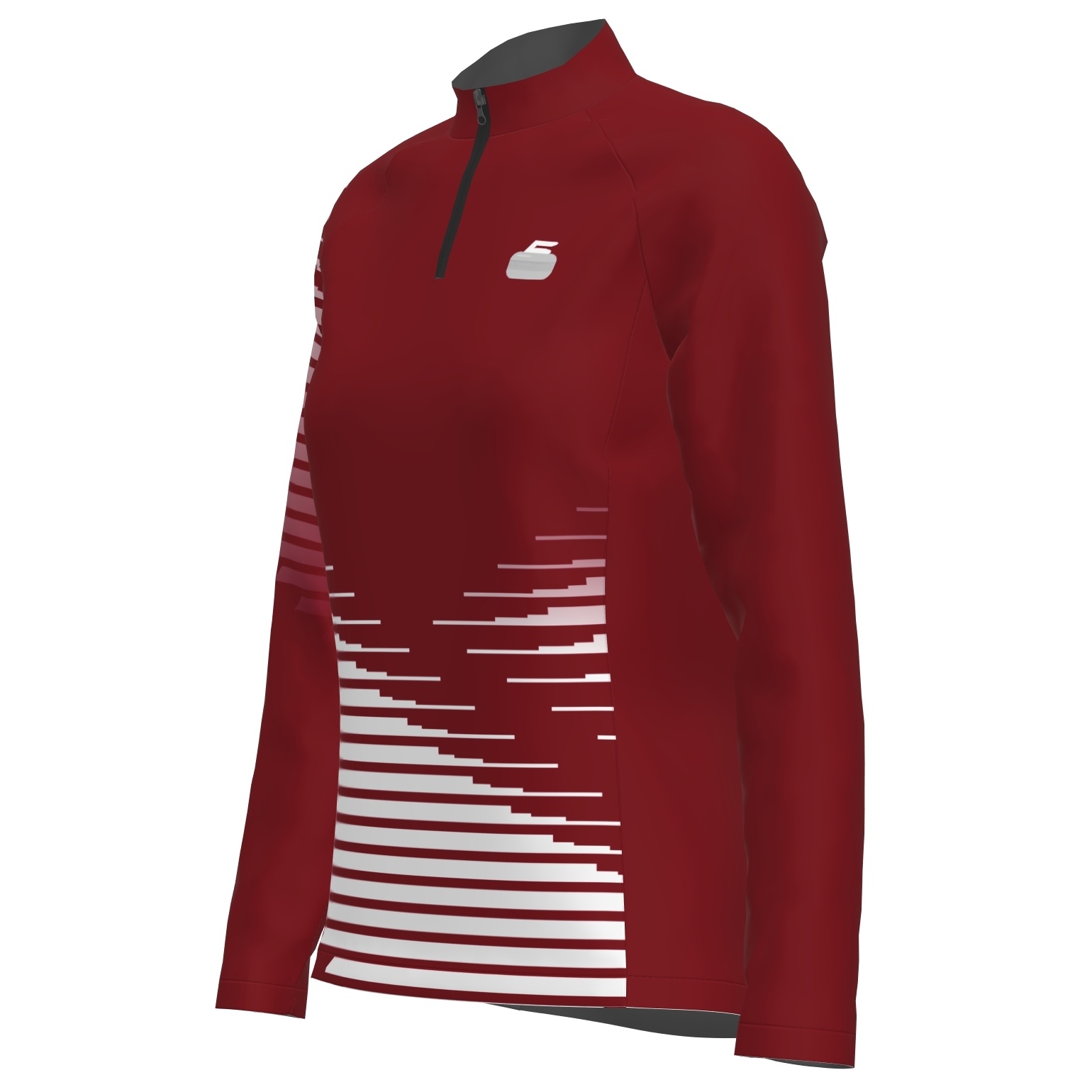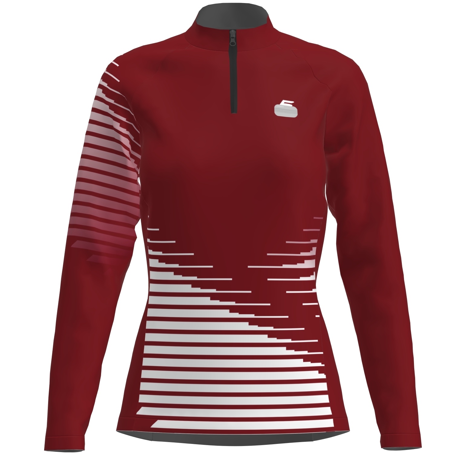 Kērlinga krekli sievietēm ar garām piedurknēm, paaugstinātu apkaklīti un rāvējslēdzēju, izgatavoti sublimācijas tehnoloģijā pēc individuāla dizaina un izmēriem.