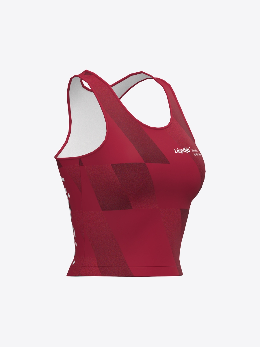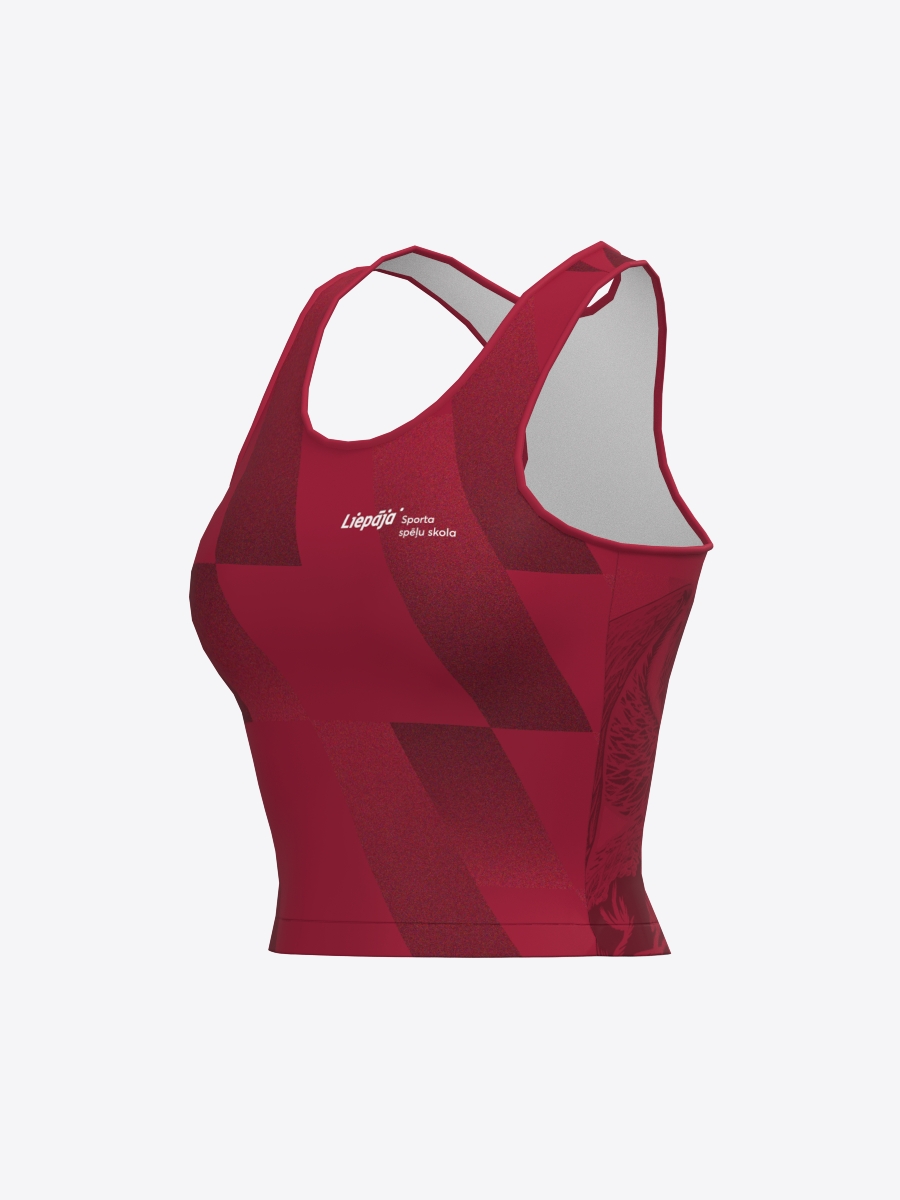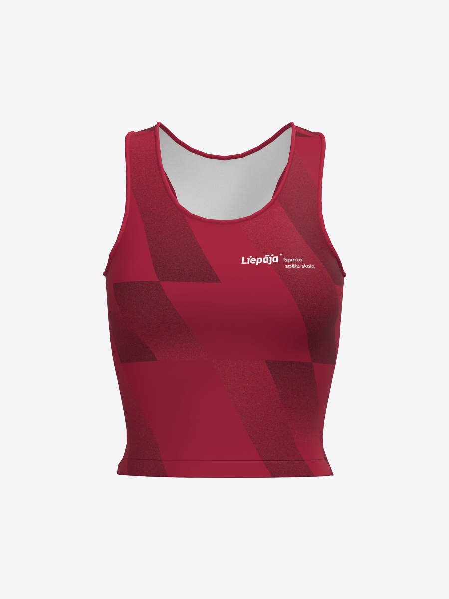 Bezpiedurkņu, pieguļošs īsais vieglatlētikas tops sievietēm Liepājas sporta spēļu skolas sportistēm, izgatavots no elastīga un mīksta materiāla. Tas ir ļoti viegls un plāns, nodrošinot labu gaisa cirkulāciju. Ātri žūstošs materiāls nodrošina komfortu un viegli absorbē un izvada lieko mitrumu.