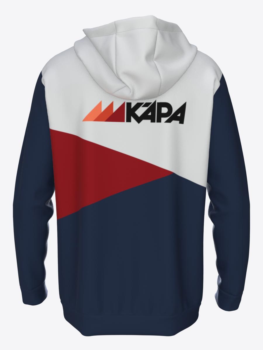 Regulāra piegriezuma OK Kāpa orientēšanās kluba džemperis ar oderētu kapuci un savelkamām auklām, lielu priekšējo ķenguru kabatu, izgatavots no silta, mīksta un nodilumizturīga materiāla, kas nodrošina vēja aizsardzību un ir ar mitruma atgrūdošām īpašībām.