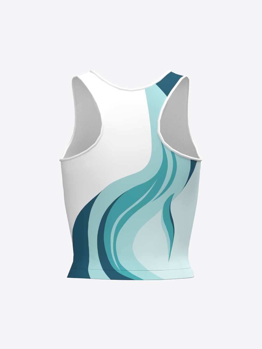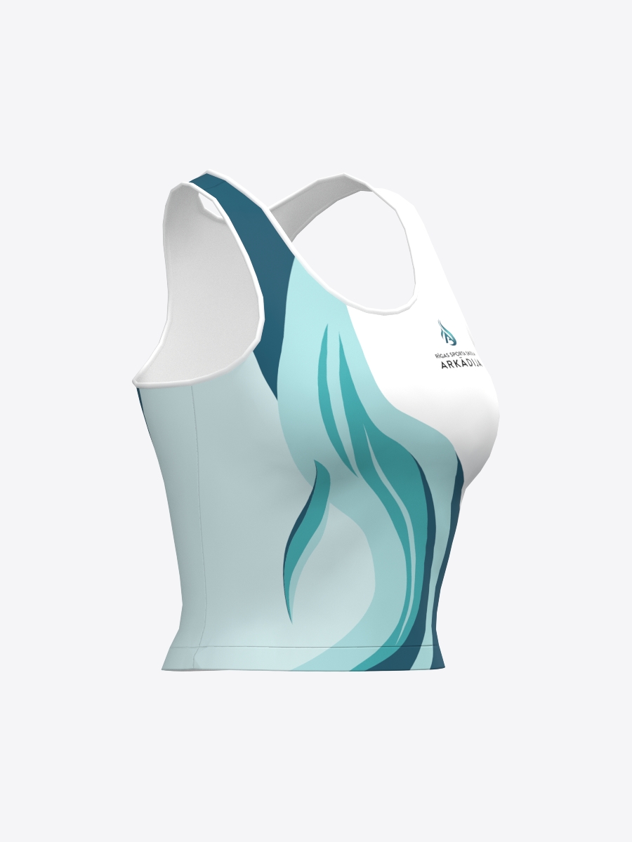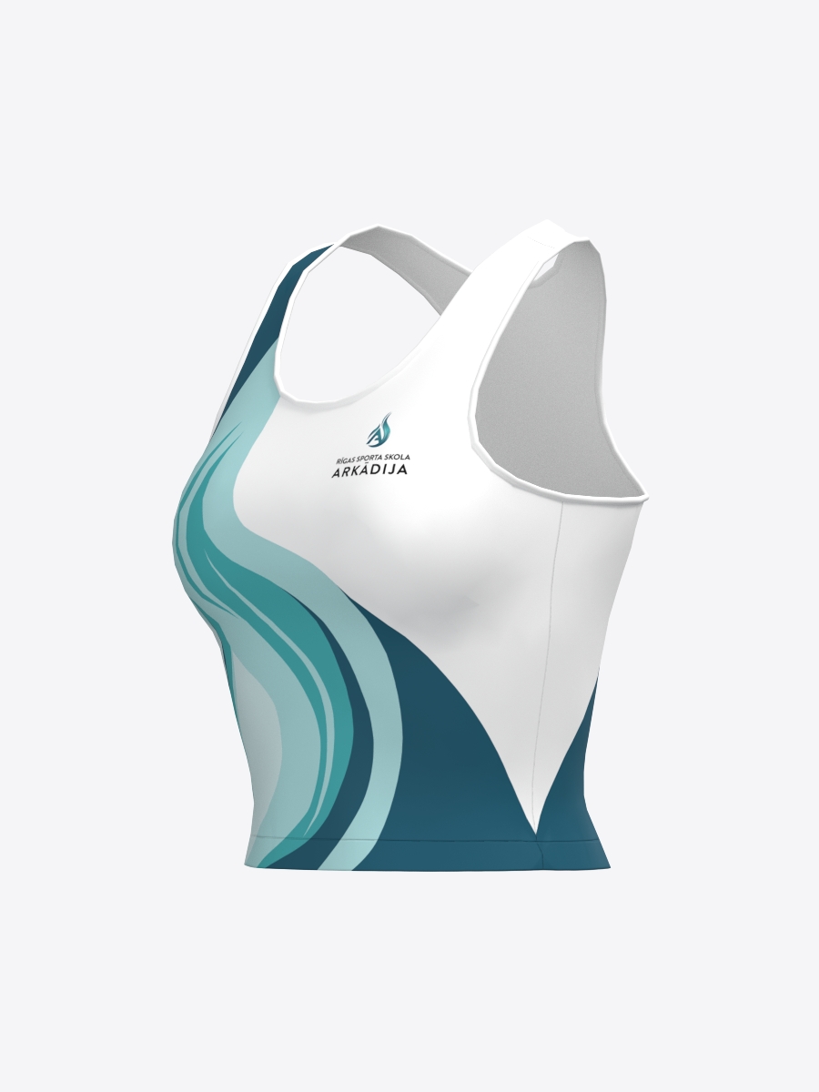 Bezpiedurkņu, pieguļošs īsais tops sporta skolas “Arkādija” audzēkņiem ar apaļu kakla izgriezumu un racerback muguras daļu, izgatavots no elastīga un mīksta materiāla. Ātri žūstošs materiāls nodrošina komfortu un viegli absorbē un izvada lieko mitrumu.